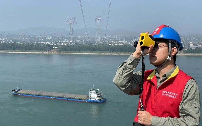 国网湖北电力员工对500千伏宜华线31#跨江塔进行保电特巡,守护万家灯火通明。丁枭雄摄